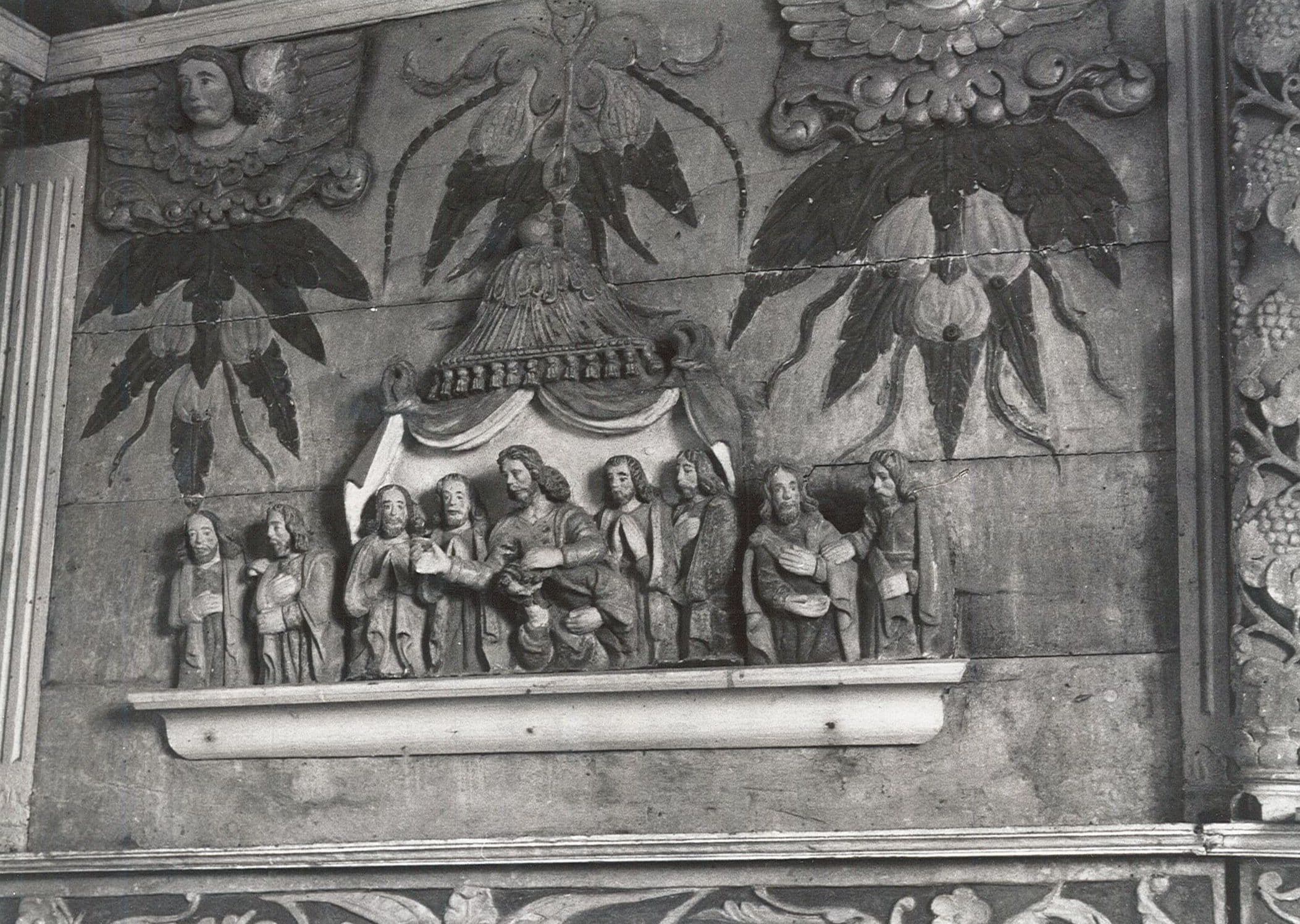 Cène : tente ; angelot : tête ; portrait : de profil, en médaillon ; pampre ; rinceau ; pot à fleur ; ostensoir