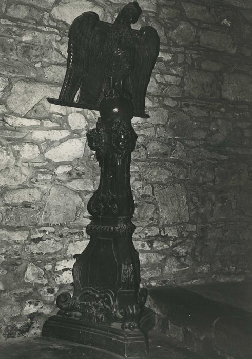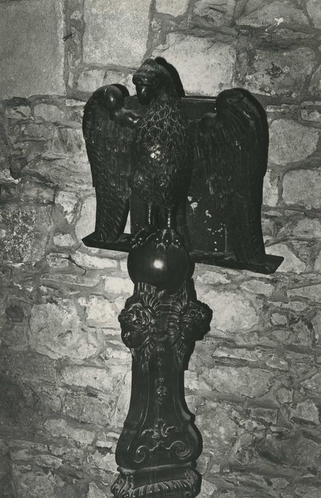 Ce lutrin se compose d'un pied triangulaire à trois panneaux, reposant sur des pattes de lion. La tige, également triangulaire, est ornée d'un décor végétal et de trois têtes d'angelots. L'aigle aux ailes éployées se tient debout sur une sphère, la tête droite.