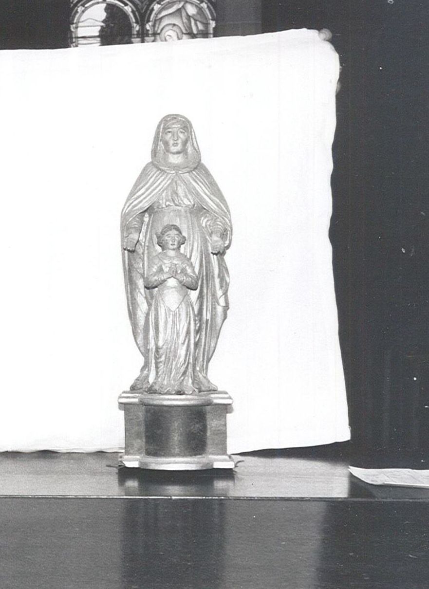 Sainte Anne, vêtue d'une robe et d'un manteau dont la capuche lui couvre la tête, se tient debout. Devant elle, debout, les mains jointes en signe de prière se trouve la Vierge enfant.