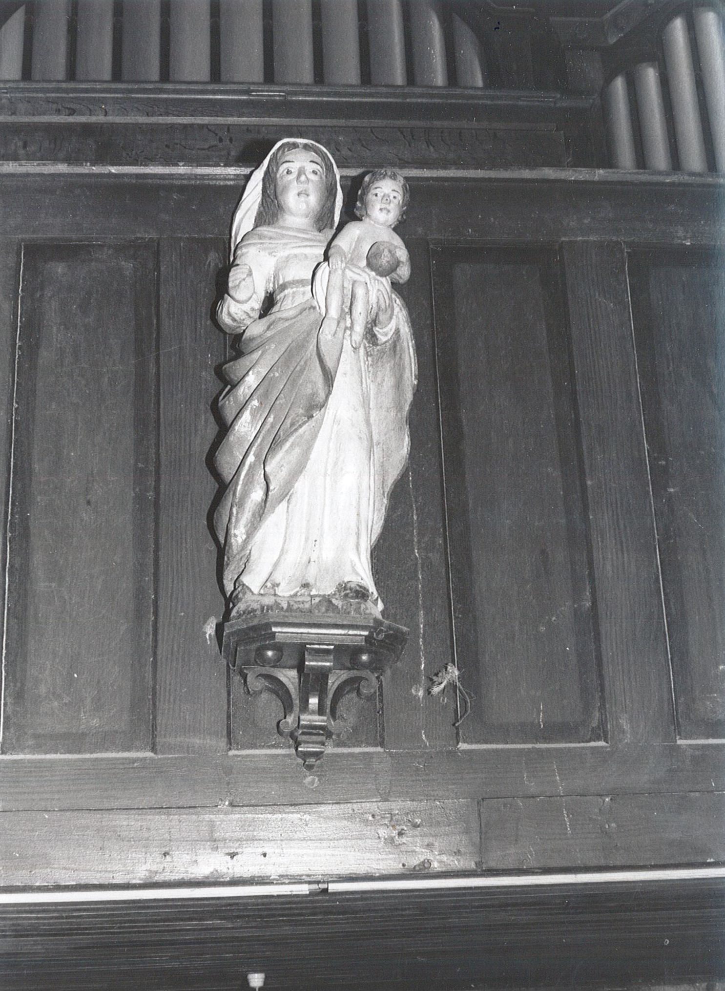 La Vierge, coiffée d'un voile, debout, porte l'Enfant Jésus sur le bras gauche. Celui-ci, vêtu d'un lange, tient un globe dans la main gauche et pose l'autre main sur son genou.
