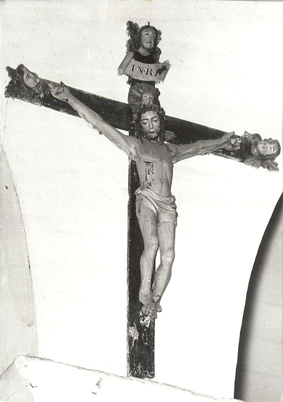Le Christ crucifié porte un périzonium noué sur la hanche droite. Les pieds superposés sont transpercés par un seul clou. Au sommet de la croix se trouve un soleil, ainsi que le titulus porté par un ange en buste. Deux têtes d'anges figurent aux extrémités de la traverse.