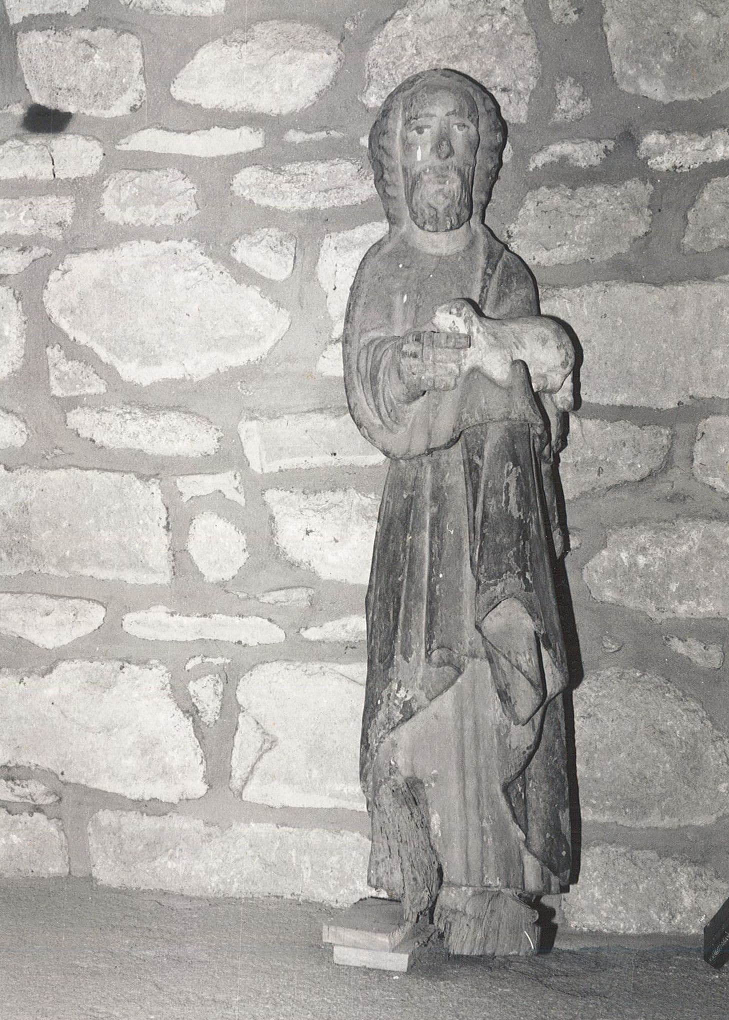 Le saint, debout, vêtu d'une tunique et d'un manteau long, porte un agneau dans les bras.