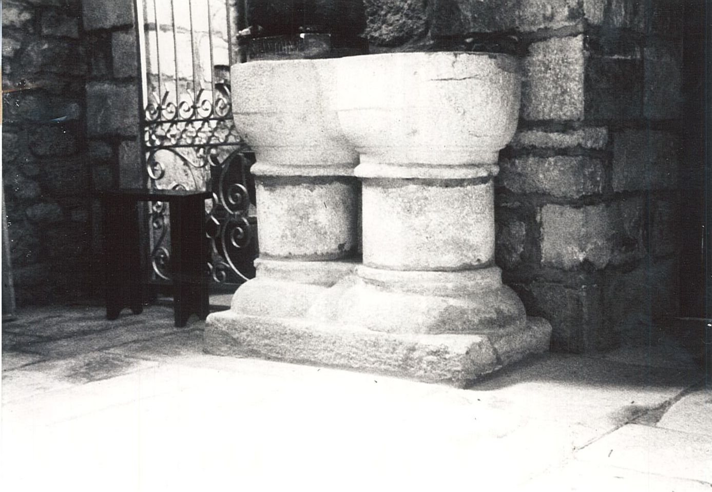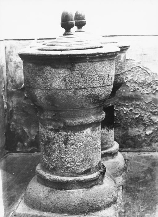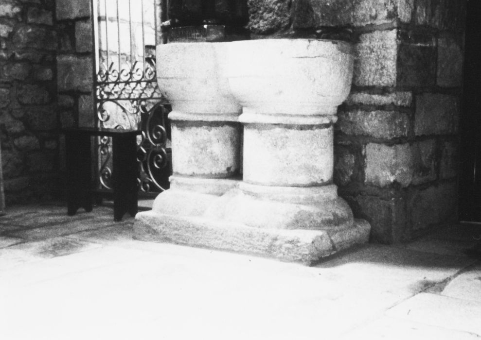 Fonts baptismaux à deux bassins, montés sur des supports cylindriques offrant deux moulures saillantes et un empattement bombé.
