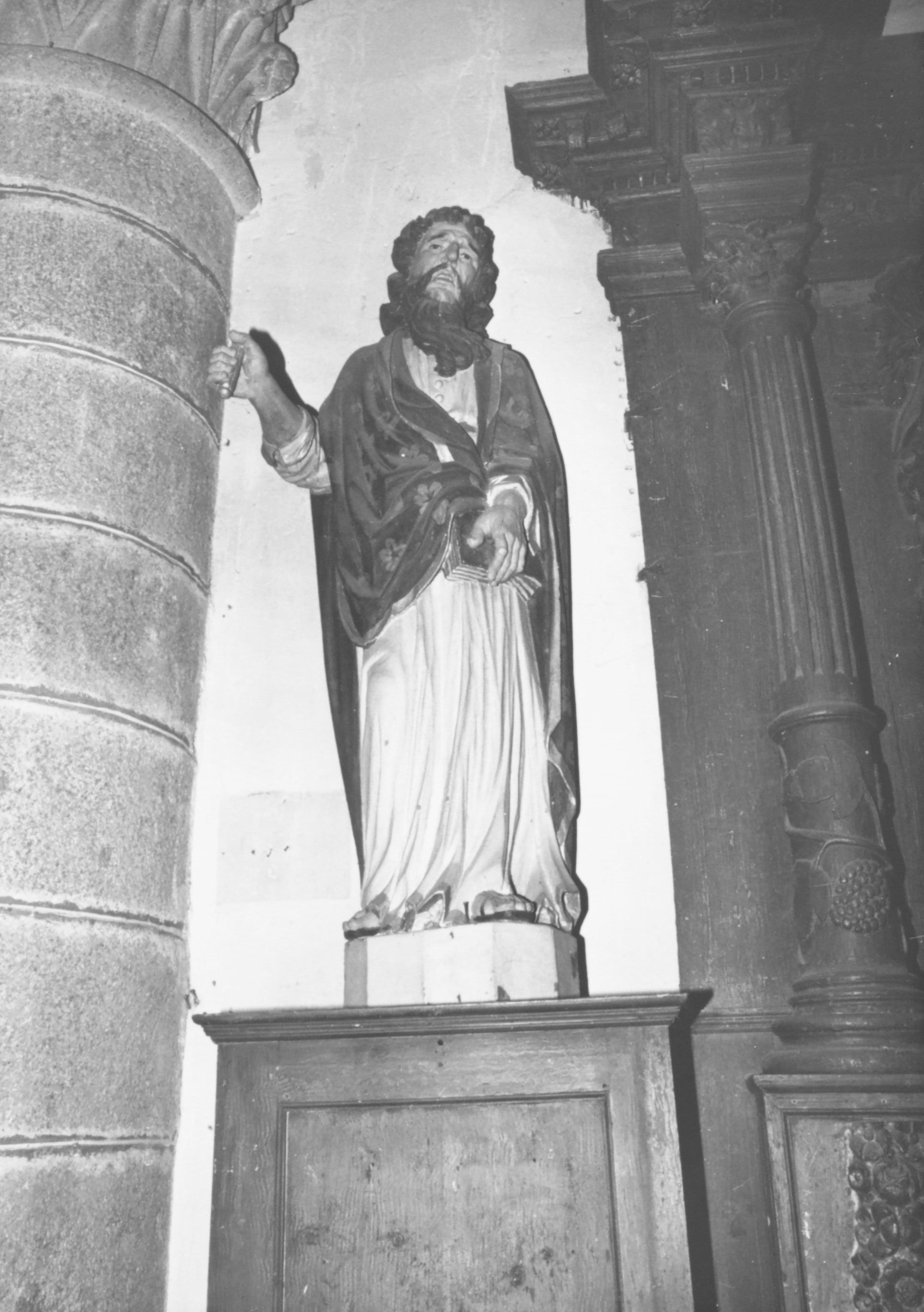 Doute sur l'identification : l'arrêté identifie cette statue comme un saint Barthélémy, mais la base CAOA hésite entre un saint Barthélémy et un saint Jean l'Evangéliste.