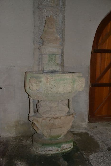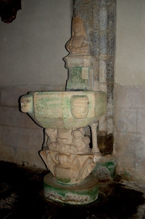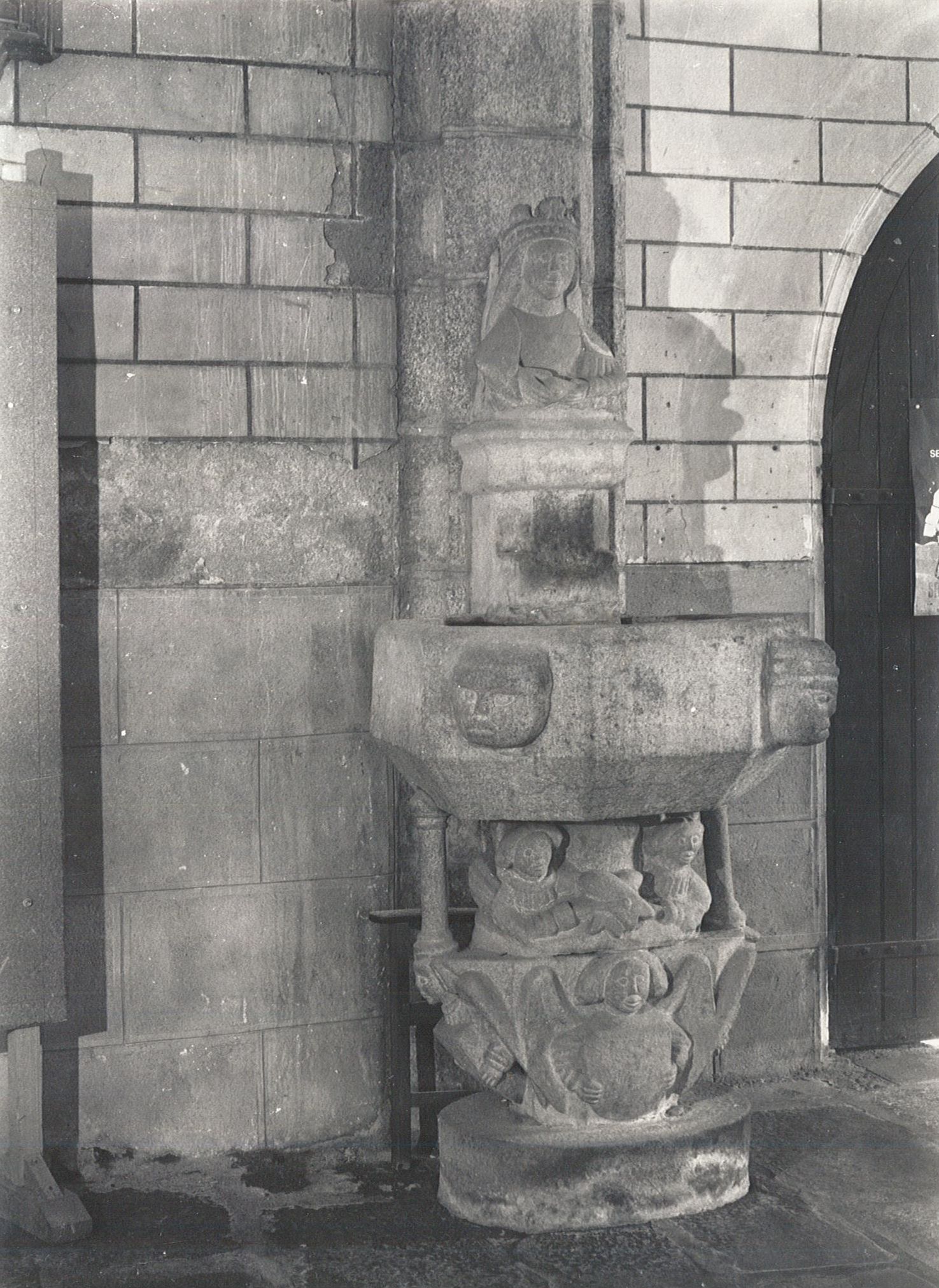 La base du bénitier représente les deux donateurs (?) et, au-dessous d'eux, un ange tenant devant lui un écu martelé. Celui-ci est entouré de deux autres anges, dans la même posture, qui servent de consoles aux deux colonnettes supportant la cuve. Cette dernière est de forme octogonale et est ornée de deux mascarons en très haut-relief. Au-dessus, se dresse une colonne supportant le buste d'une Vierge couronnée, qui devait être une Vierge à l'Enfant (tête de l'Enfant manquante).