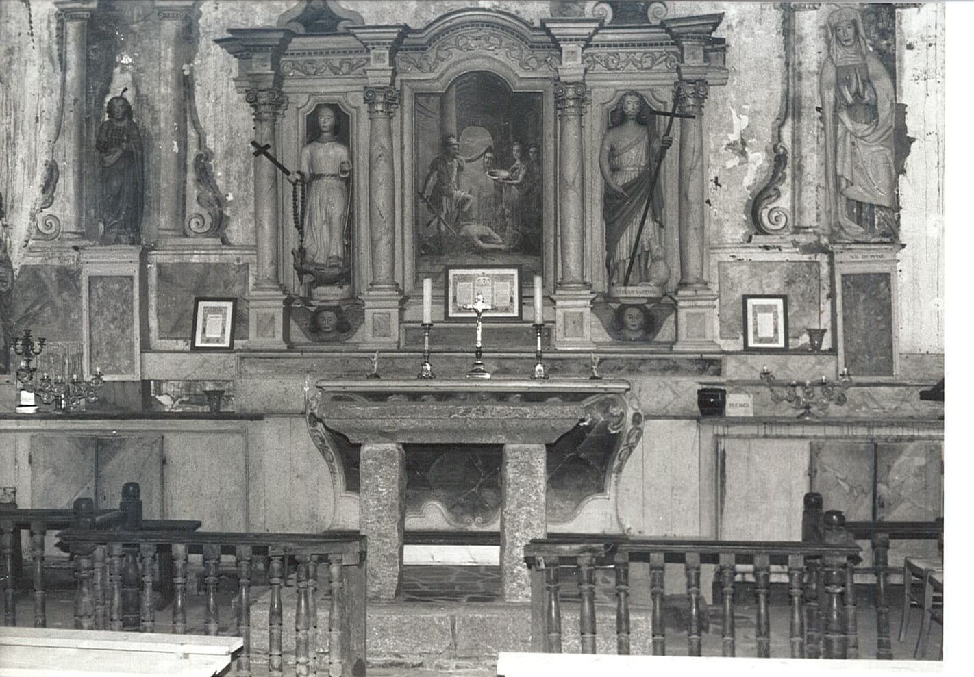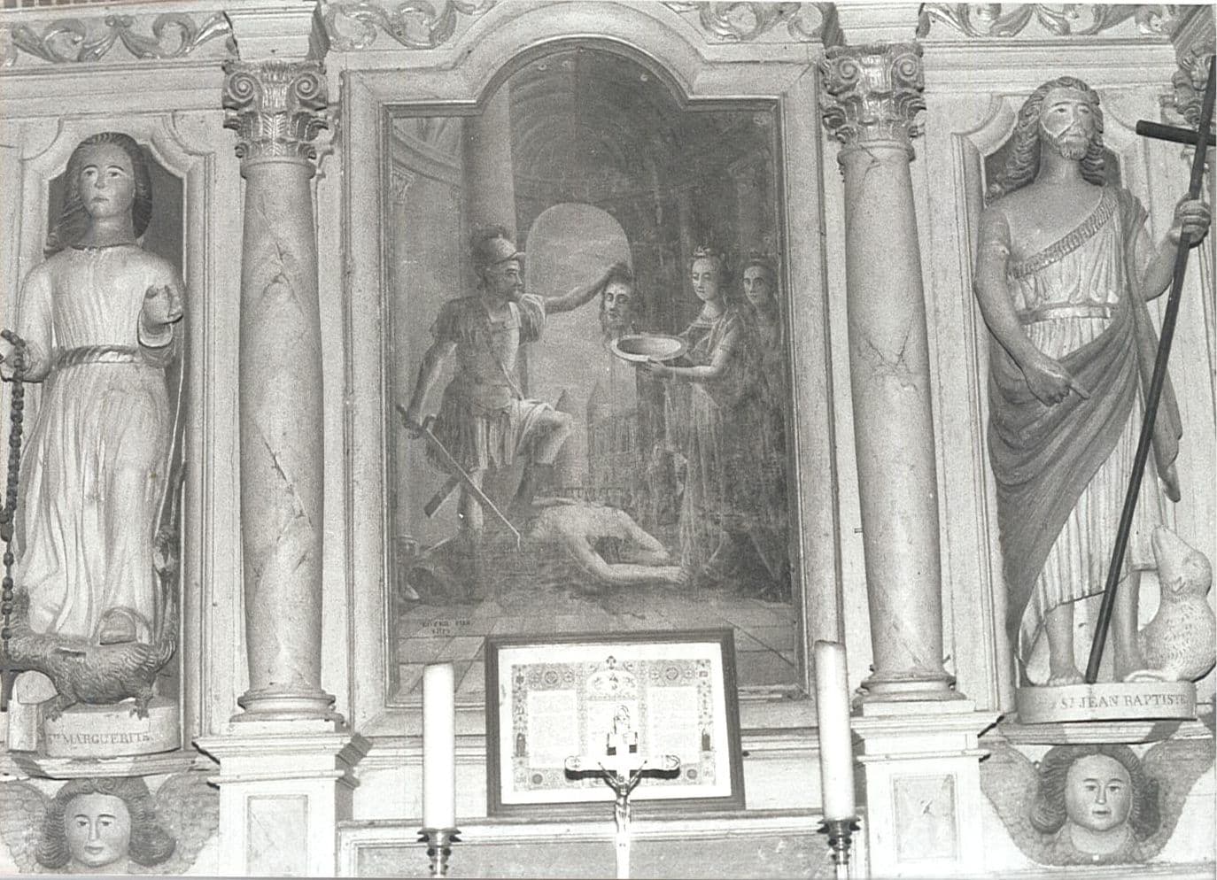 autel (maître-autel), retable, deux statues : Saint Jean-Baptiste et Sainte Marguerite, et tableau : Décollation de Saint Jean-Baptiste