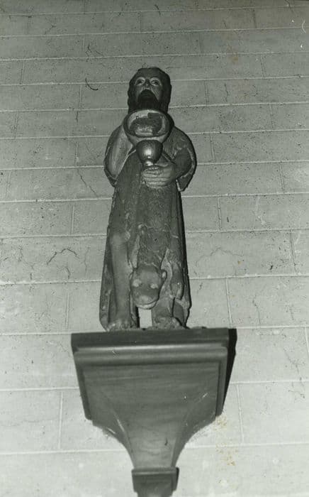 Le saint est vêtu d'une peau de bête. La tête de l'animal pend sur ses jambes. Il tient une coupe dans la main gauche et la représentation d'un agneau de l'autre main.