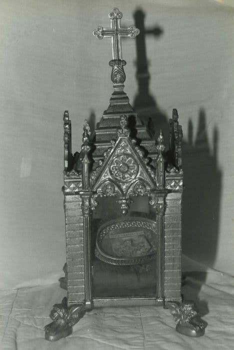 Reliquaire ou châsse prenant la forme d'une chapelle surmontée d'une croix. Les éléments architecturaux sont de style néo-gothique. Les reliques de saint Thurian sont contenues dans un écrin d'argent, déposé au coeur de la châsse.