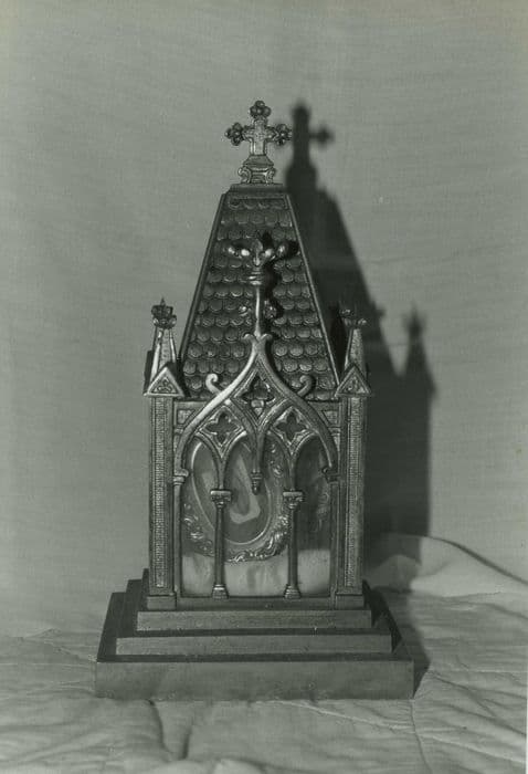 Reliquaire ou châsse prenant la forme d'une chapelle, reposant sur trois degrés, comprenant des arcatures triples à motifs quadrilobés, surmontées de gâbles et de pinacles. Le toit est couronné d'une croix tréflée. Les éléments architecturaux sont de style néo-gothique.