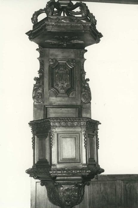 Chaire dont le dorsal, augmenté d'ailerons en volute, est orné d'un panneau de forme octogonale présentant le monogramme du Christ, ainsi que de têtes d'angelot aux coins supérieurs. Une colombe du Saint-Esprit est sculptée sous l'abat-voix. Le tout est surmonté d'un couronnement décoré de têtes d'angelots.