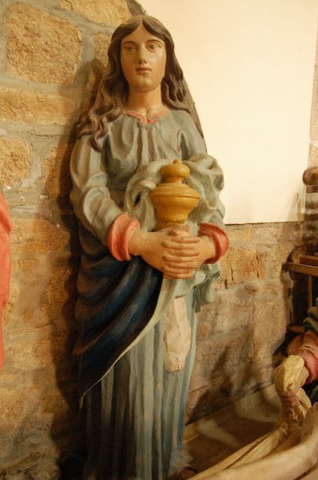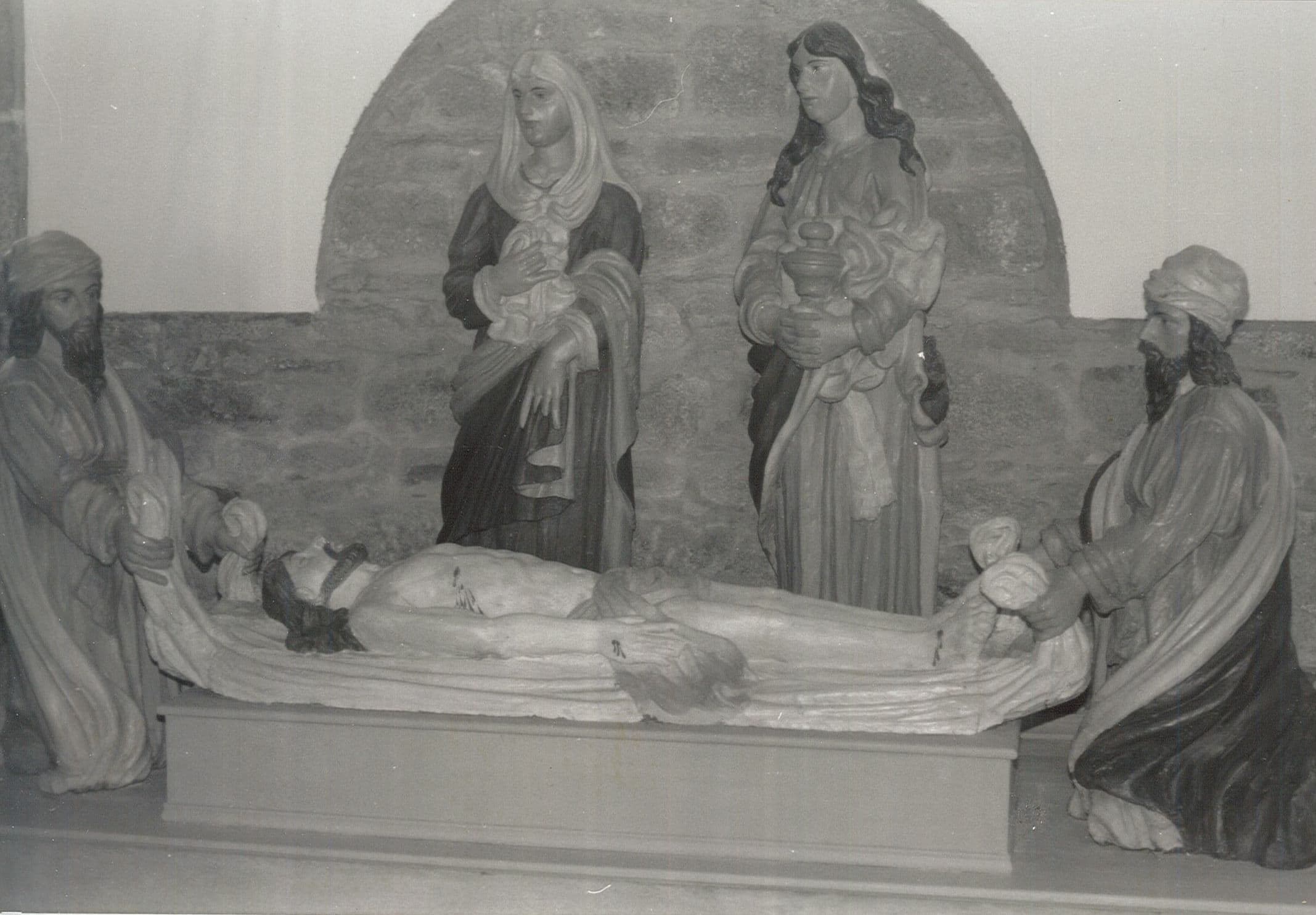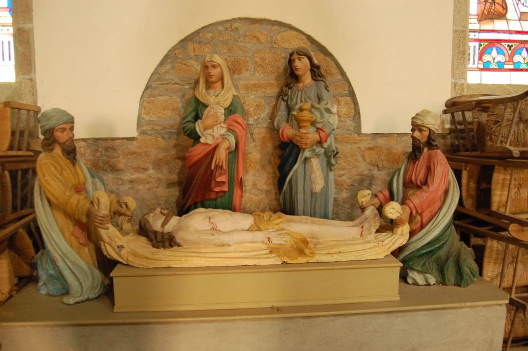 Cet ensemble comprend les statues du Christ allongé, de saint Joseph d'Arimathie et de saint Nicodème, agenouillés de part et d'autre de la dépouille, et tenant le linceul par ses extrémités, et de la Vierge et sainte Marie-Madeleine, qui tient un vase.