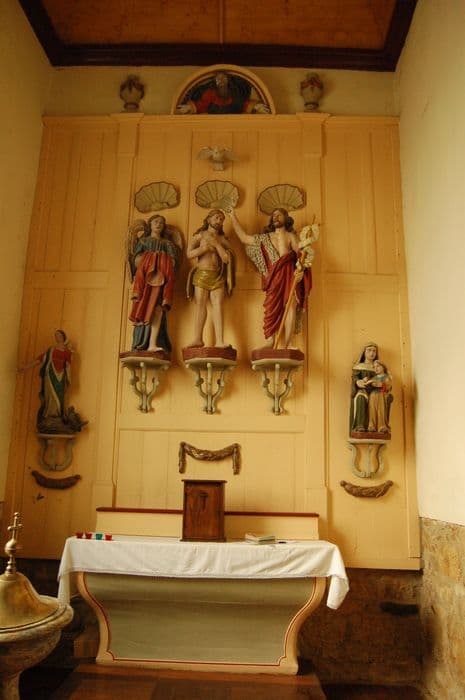 autel, boiseries de la chapelle des fonts baptismaux et cinq statues : Baptême du Christ