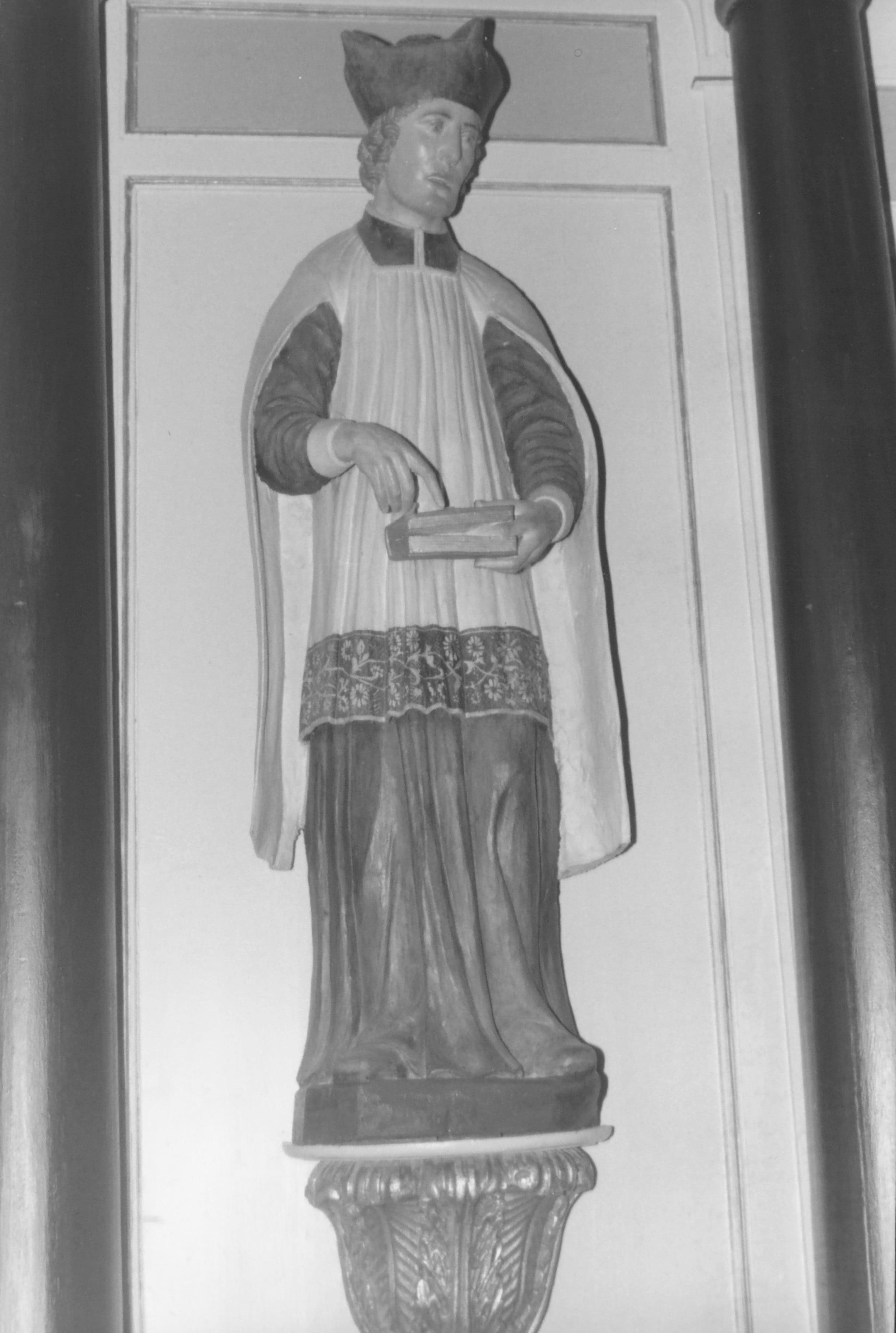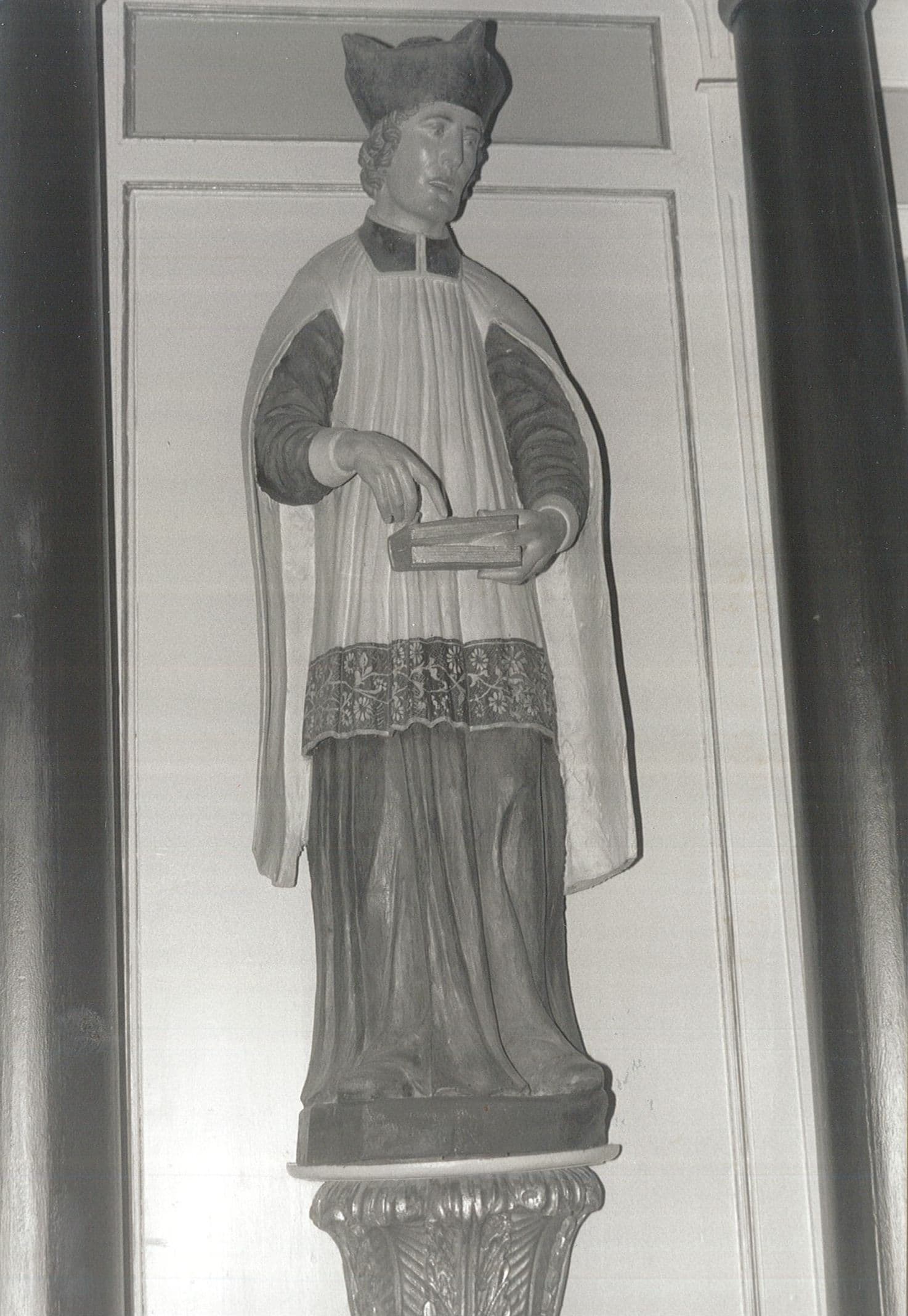 Le saint, vêtu du surplis et portant la barrette, semble effectuer une plaidoirie. Il désigne de l'index droit le livre entrouvert qu'il tient.