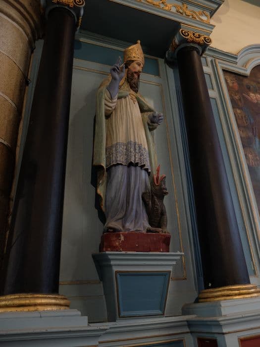 Le saint évêque, portant la mitre et la chasuble, bénit de la main droite. A ses pieds se dresse un animal à la langue pointue, peut-être un loup. Ce dernier élément permettrait peut-être d'identifier cette statue comme celle d'un saint Loup, comme le suggère sans certitude l'arrêté.