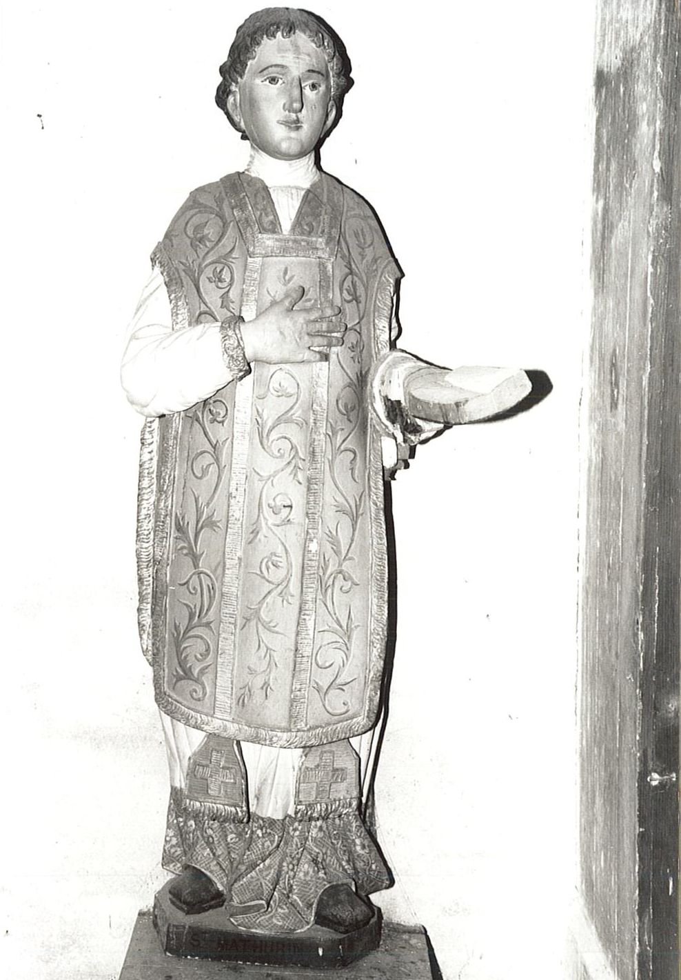 Le saint, vêtu d'une chasuble et d'une étole, tient un livre ouvert dans la main gauche.