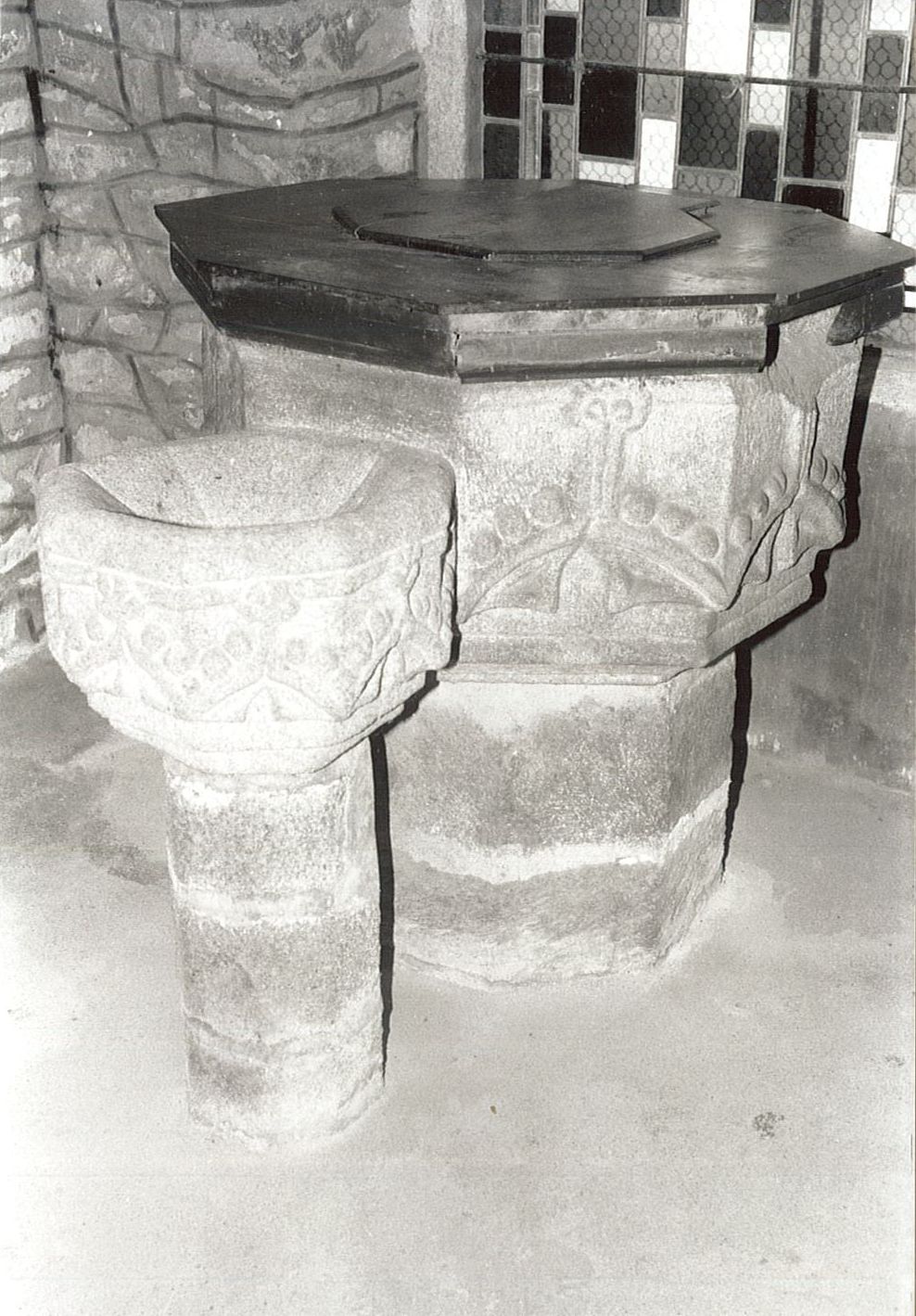 Fonts baptismaux à deux cuves octogonales, une grande et une petite, reposant sur des fûts octogonaux. La grande cuve est recouverte d'un couvercle en bois.