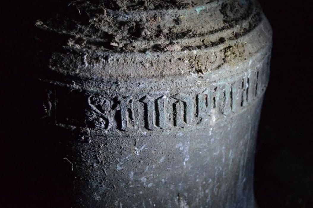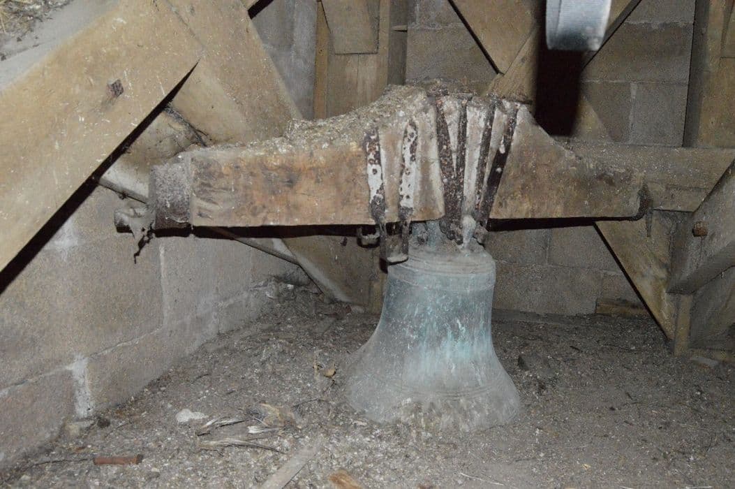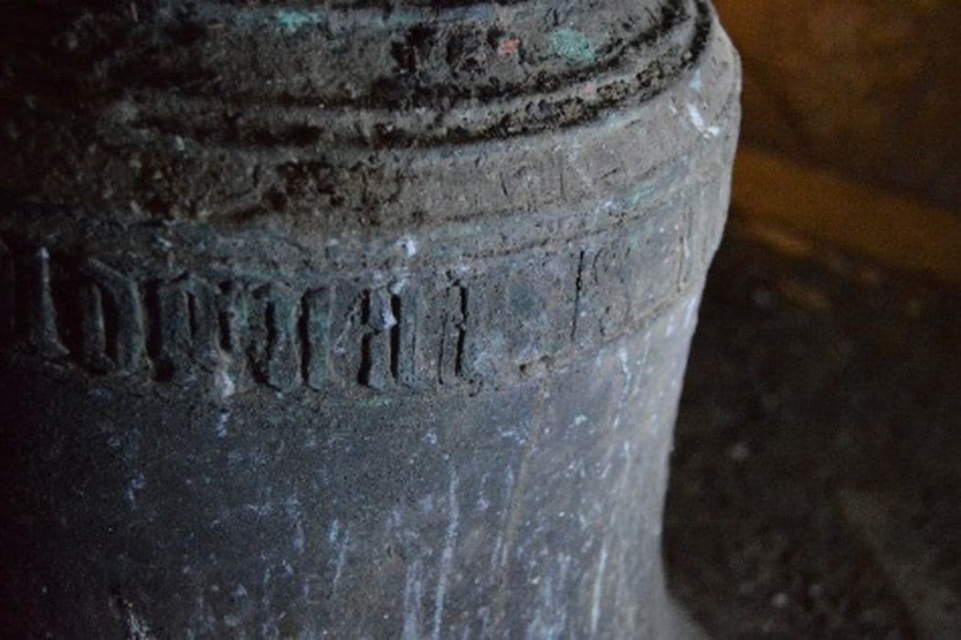Cloche portant inscription en caractères gothiques sur une seule ligne, dans un bandeau encadré de filets.