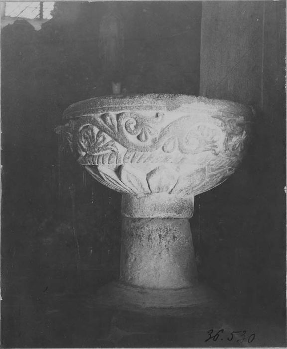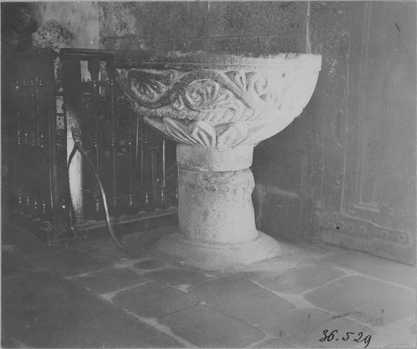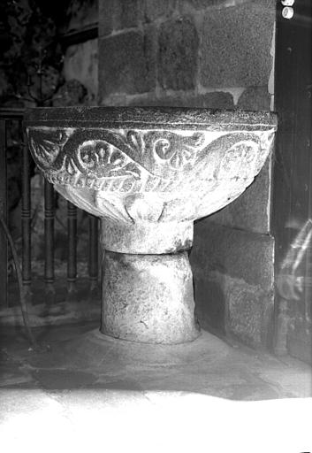 Le bénitier se compose d'une cuve hémisphérique et d'un piètement de section circulaire. Tout le pourtour de la cuve est sculpté.