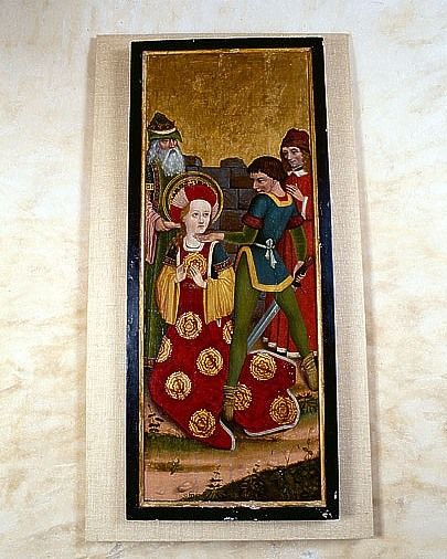 La sainte est agenouillée, les mains jointes. Elle est richement vêtue d'une robe à motifs floraux et porte un turban dans les cheveux. Le bourreau, debout à droite, tient le menton de la sainte dans la main gauche et son épée dans l'autre main. Deux personnages masculins (dont le proconsul romain ?) complètent la scène sur fond de murailles.