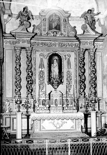 Ensemble composé d'un autel rectangulaire sur lequel sont posés deux gradins qui supportent une armoire de tabernacle à ailes (ornée par quatre statuettes). Le retable architecturé est organisé autour d'une niche centrale, entourée par des paires de colonnes qui portent un entablement et un fronton brisé. Deux statues sont placées sur les rampants du fronton, une troisième occupe la niche de l'élément central de ce fronton.