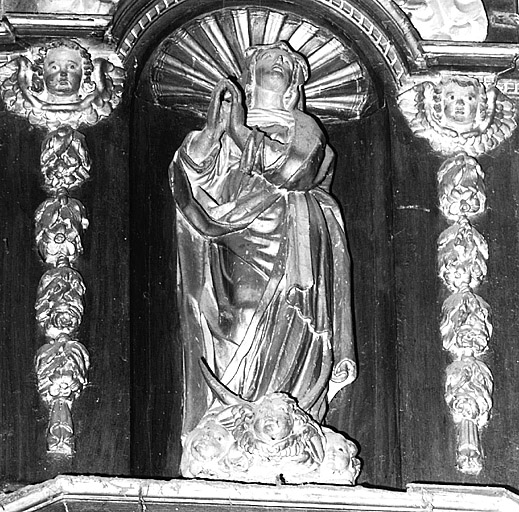 La Vierge, debout, est vêtue d'une robe, d'un manteau et d'un voile dissimulant une partie de ses cheveux. Hanchée, elle joint les mains sur sa droite et lève les yeux au ciel. La base, peuplée par trois angelots présente un croissant.