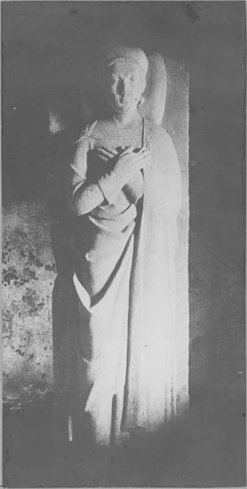 Oeuvre mutilée : la tête du chien est cassée, l'index de la main droite manque, le nez est rogné.