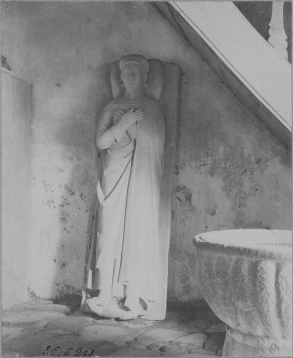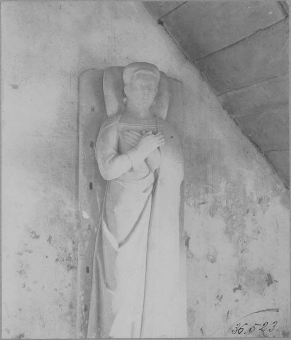 La dalle de forme rectangulaire est sculptée d'un gisant. L'un des côté présente sept trous alignés (ancien scellement d'une grille ?).