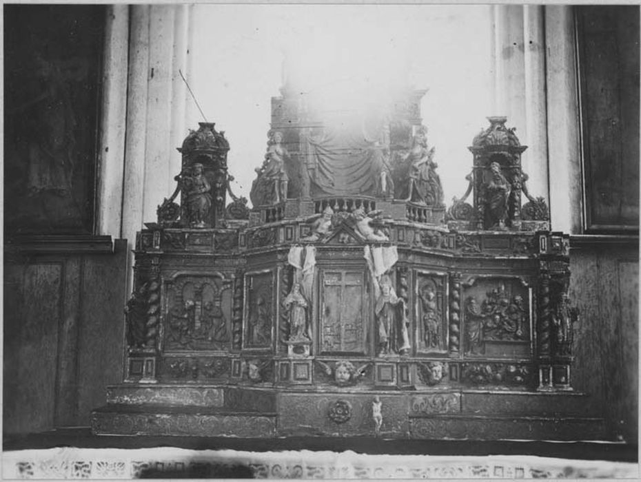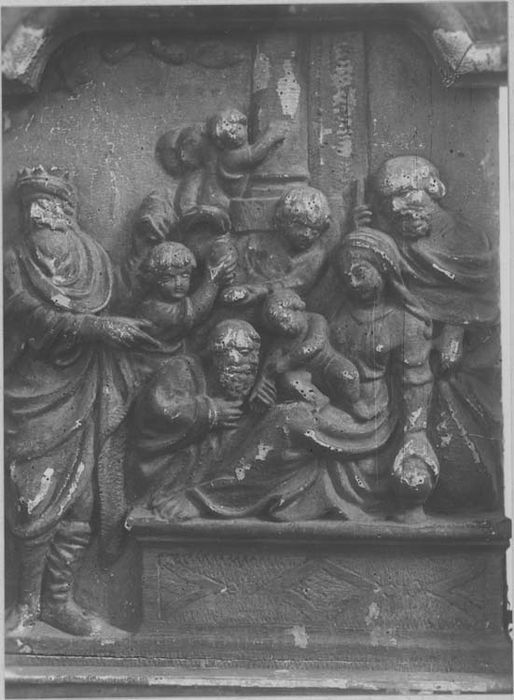 Paraissant dater de la 2e moitié du 17e siècle, cet ensemble pourrait néanmoins être postérieur. La scène de l'Adoration des Mages, sur l'aile droite du tabernacle, est une copie de la gravure de la Bible de Royaumont.