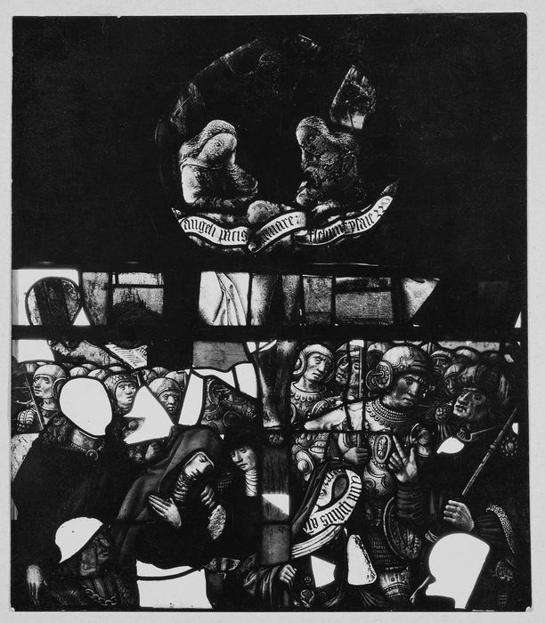 Il ne subsiste de cette verrière que quelques éléments anciens, eux mêmes lacunaires (visages de saint Jean et de sainte Madeleine), remontés en incrustation dans une verrière moderne : avant 1913 ?
