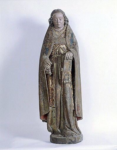 Statue en bois sculpté, polychromé et doré. Elle comporte une base polygonale et présente un revers en partie évidé avec traces de gouge.