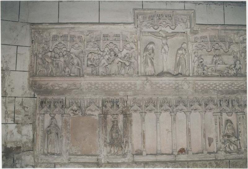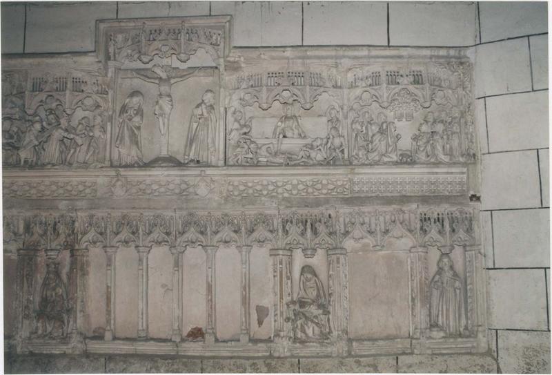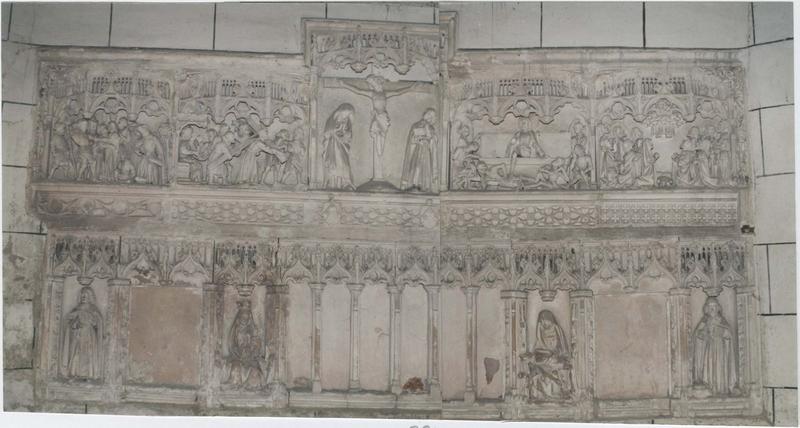 Au registre supérieur sont juxtaposées cinq scènes séparées par des piliers et entourées d'une guirlande végétale avec des anges thuriféraires. Chacune d'entre elle est surmontée par une triple arcature de style gothique flamboyant avec arcs tréflés sur pendentifs, gâble, pinacles et alignement de petites lancettes. De gauche à droite les scènes représentent : l'arrestation du Christ au Jardin des oliviers (Judas embrasse Jésus, saint Pierre tranche l'oreille du soldat) ; la montée au Calvaire (sur la gauche, Pilate est assis dans une cathèdre et se lave les mains) ; le Calvaire dont le dais constitue le fronton du retable (le Christ incline la tête vers la gauche, la Vierge joint les mains, saint Jean regarde le Christ en soutenant sa tête dans sa main gauche et en tenant un livre de son autre main) ; la résurrection du Christ (deux anges tiennent la dalle qui recouvre le tombeau et permettent au Christ d'en sortir, il enjambe la cuve au milieu de quatre soldats endormis) ; l'ascension (seuls les pieds du Christ sont visibles dans une nuée, au sol sont agenouillés les apôtres et la Vierge). Un bandeau ornemental sépare les deux registres, compartimentés en cinq rectangles, il est sculpté de divers quadrilobes et de deux écus. Le registre inférieur présente une succession de 12 arcatures au décor sensiblement identique à celle du registre supérieur : six arcatures doubles entourent autant d'arcatures simples. Les arcatures doubles qui accostent directement la série centrale abritent la Vierge à l'enfant (à gauche) et la Vierge de Pitié (à droite). Deux personnages sont représentés sous les arcatures des extrémités : un homme vêtu d'une tunique et d'un manteau qui tient une paire de gants (à gauche) ; un homme barbu vêtu d'une tunique et d'un manteau, la tête coiffée d'un bonnet moulant.