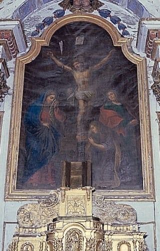 POP | Plateforme ouverte du patrimoineretable du maître-autel, tableau : le Calvaire avec sainte Madeleine, 2 statues : Saint Maurice, Saint Jean-Baptiste