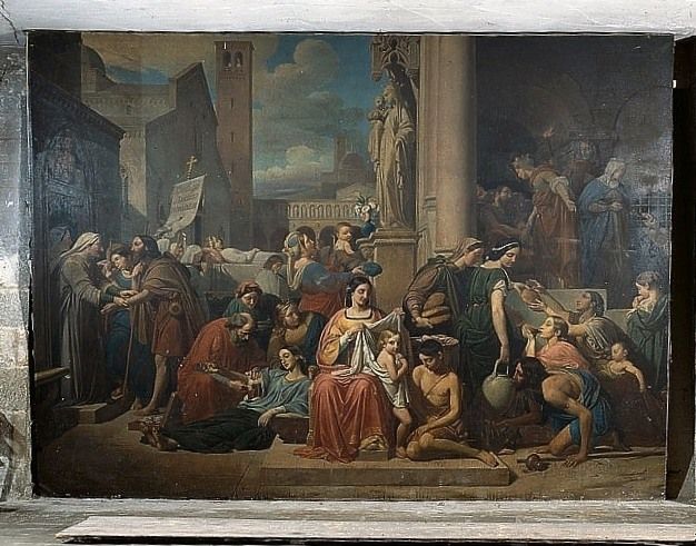 Ce grand tableau de Jean-Louis Bézard fut exposé au Salon de 1839. Avec oeuvre apparentée connue : il représente un thème fréquemment illustré par ce peintre (peinture murale de l'église Sainte-Elisabeth à Paris, commandée en 1844) ; les esquisses du tableau d'Aubusson sont conservées au musée du Petit Palais à Paris (notamment inv. PPP 4507). Propriété de l'Etat, Fonds national d'art contemporain (FNAC).