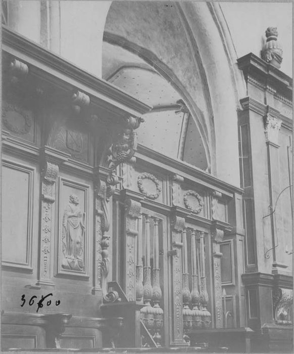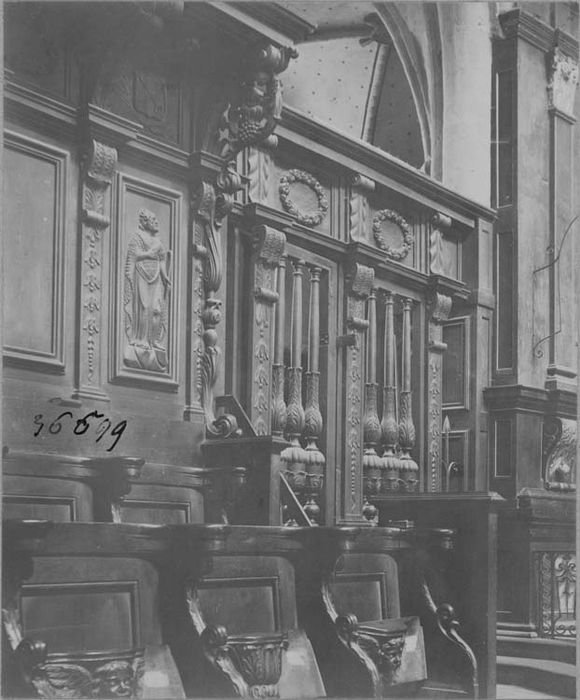 1911/09/30 classé au titre objet : boiseries, stalles, clôture de choeur 17e siècle. Après leur destruction dans un incendie, dites déclassées par arrêté du 2 mars 1945, et rayées de la liste départementale.