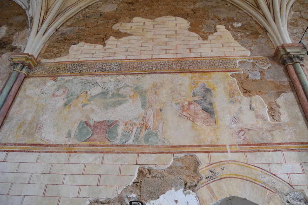 La voûte de la cinquième travée, dont la clef est sculptée du Christ bénissant, présente sur deux voûtains un homme ailé et probablement un taureau ailé autour desquels se déployaient apparemment des anges, les deux autres voûtains devaient représenter l'aigle de saint Jean et le lion ailé de saint Marc. Le mur nord, à partir de la seconde travée, présente neuf scènes de martyres ; à chacune sont associés deux anges recueillant l'âme du saint sous la forme d'un petit personnage nu. La série des supplices se poursuit sur le côté sud du mur oriental : un personnage est déshabillé, avant son martyre, tandis qu'au-dessus un petit personnage se fait déchiqueter par une roue (martyre de sainte Catherine d'Alexandrie, à laquelle était dédié un autel secondaire, ?). Sur le mur est, sont peintes également des croix de consécration : croix pattées rouges sur fond bleu entourées de fleurons et inscrites dans un cercle, et un Calvaire surmontant une Vierge à l'enfant en majesté. Les ébrasements de la baie du mur oriental représentent d'un côté l'arbre de Jessé dont seuls Jessé, David et Salomon sont conservés, de l'autre les travaux des mois dont la vendanges du mois de septembre est la scène la mieux conservée. Sur le mur sud de la seconde travée, au-dessus de la porte, un personnage agenouillé joue d'un luth à manche long. Sur le mur sud de la quatrième travée et le mur nord de la seconde travée, des scènes très lacunaires.