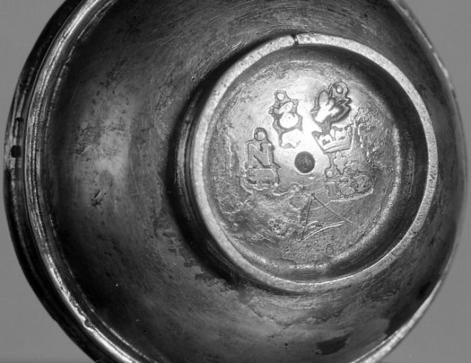 Les quatre poinçons sont insculpés au revers du fond. Poinçon de charge ou de décharge : une abeille sur un grain (couronnée ?). Poinçon de charge ou de décharge : une tête (?) couronnée au-dessus d'un grain. Lettre-date : un N couronné (couronne fermée ?) au-dessus d'un grain. Poinçon de maître-orfèvre : fleur de lys couronnée entre deux grains, IB un canard.