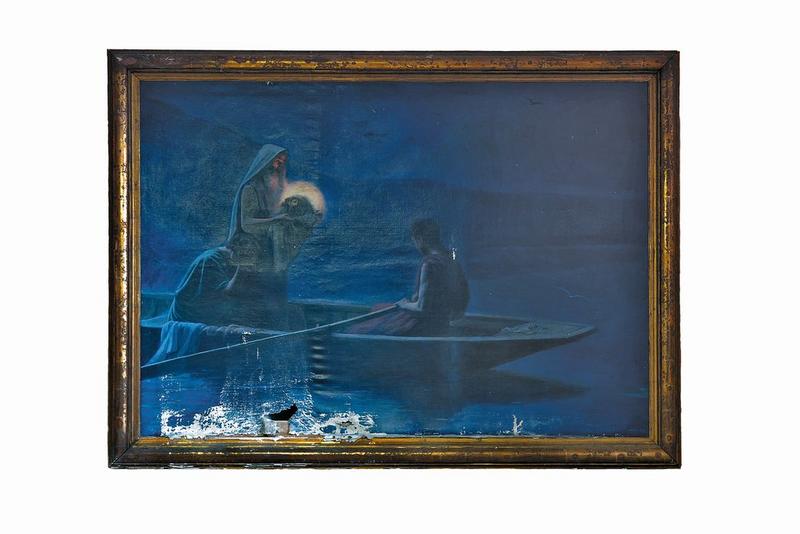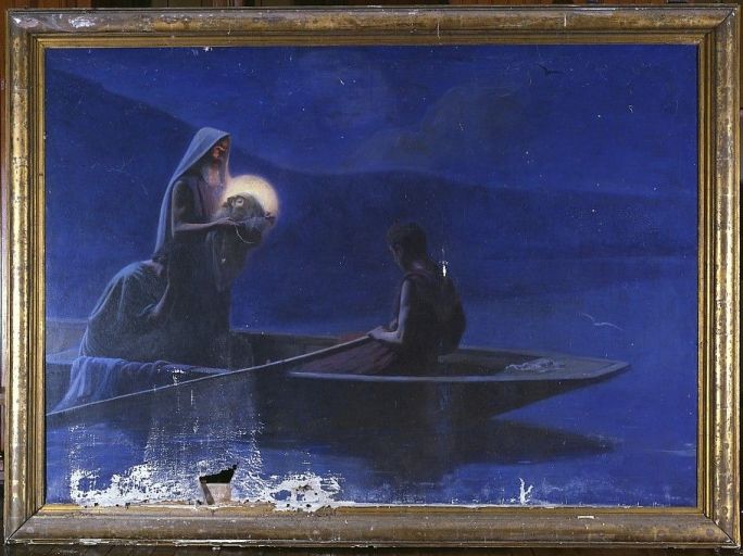 Trois hommes sont sur une barque, de nuit. L'un rame, le deuxième cache sa tête dans ses mains en signe de tristesse, le troisième, debout, voilé, porte la tête de saint Jean-Baptiste, auréolée et seule source de lumière de la scène.