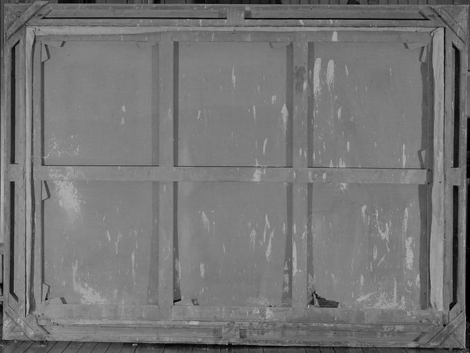 Très mauvais état : fissurations, craquelures, lacunes, cadre disjoint, châssis en bon état mais présentant des trous d'insectes.