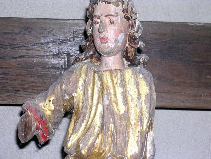 Ensemble de statuettes provenant très probablement d'un tabernacle, du 17e siècle. La statuette de Vierge à l'enfant, repeinte, est un peu plus haute que les autres, mais de facture similaire.