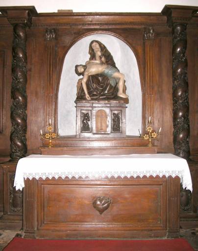 Cet ensemble du 17e siècle, remonté dans la chapelle sud, provient peut-être du choeur. L'autel et la niche centrale du retable ont peut-être été refaits. Le groupe sculpté de la Vierge de pitié, posé sur le tabernacle, n'en fait pas partie (cf. notice PM23000038).