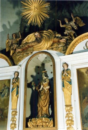 retable, 2 tableaux : la Nativité, le Couronnement de la Vierge, statue : Vierge à l'Enfant, haut-relief : Dieu le Père