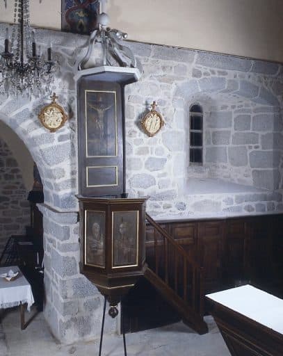 Chaire à prêcher adossée, accessible par un escalier latéral à une volée droite. Cuve hexagonale, munie d'un battant. Abat-voix orné de volutes découpées surmontées d'un globe, le tout peint en blanc.