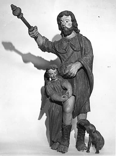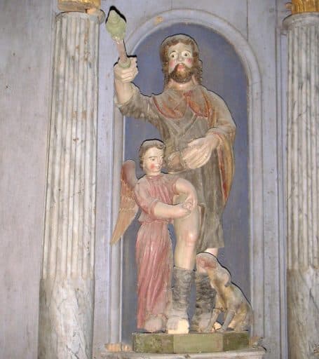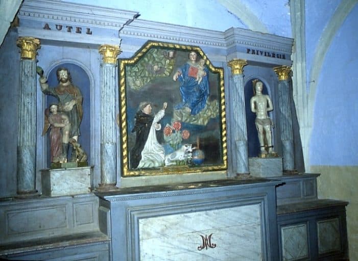 autel, retable architecturé, tableau d'autel : la Remise du rosaire à saint Dominique, groupe sculpté : saint Roch et l'ange, statue : saint Sébastien (autel privilégié de la chapelle sud)