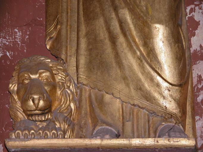 Statues empoussiérées. Quelques lacunes de dorure. La tête de l'aigle de saint Jean est rongée par une vermoulure active.