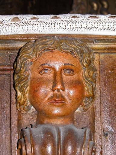 Christ glorieux, colonne torse ; colonne cannelée, chapiteau corinthien, ornement végétal, coquille, angelot, volute, guirlande, ornementation ; saint : évêque ; apôtre ; saint Paul de Tarse (épée) ; sainte Catherine d'Alexandrie (couronne, épée, roue, foulant aux pieds : empereur) ; Calvaire ; saint : évêque ; saint Jean-Baptiste, agneau