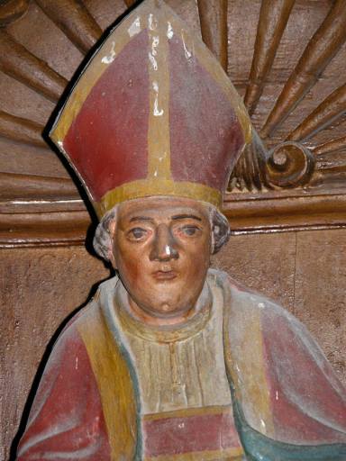 La statuette de saint évêque du tabernacle est vermoulue. Le retable a été entièrement décapé de sa polychromie, il subsiste des vestiges d'enduit dans les creux du décor en partie haute.