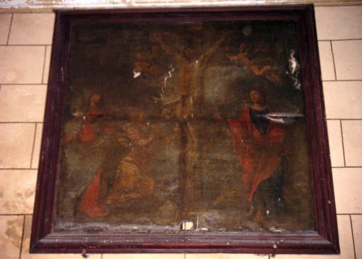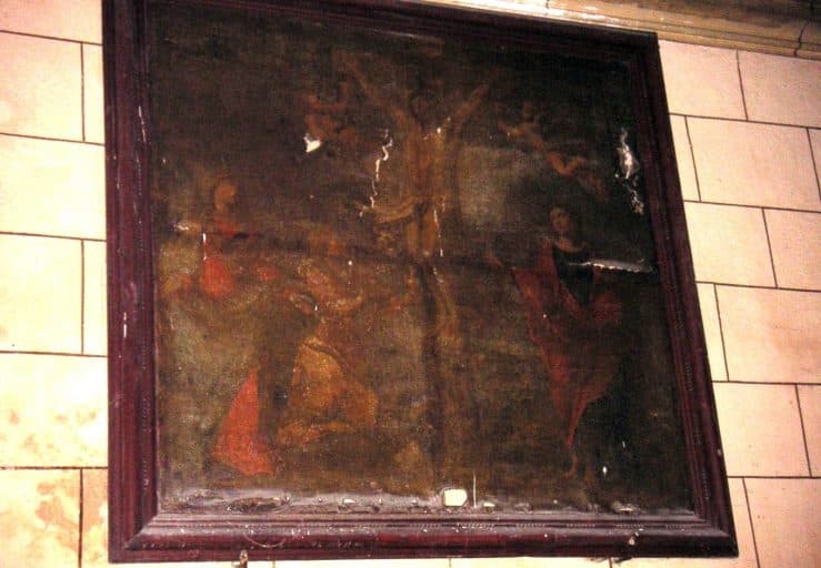 tableau et cadre : Calvaire avec sainte Madeleine et deux anges recueillant le sang du Christ