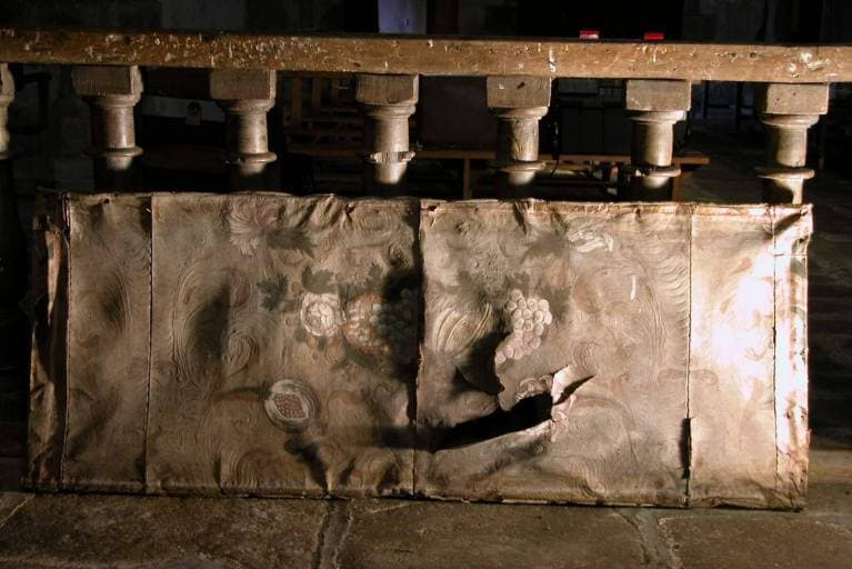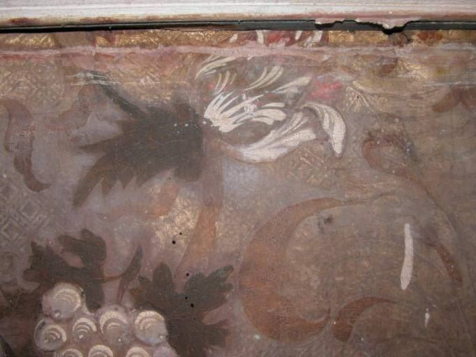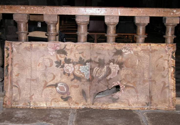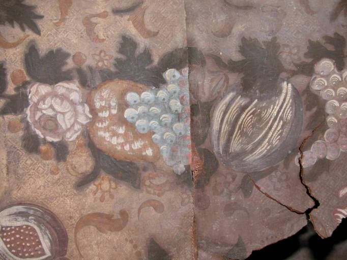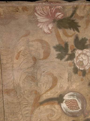 cuir (support, en plusieurs lés) : gaufré, argenté à la feuille, vernis coloré, peinture à l'huile, polychrome