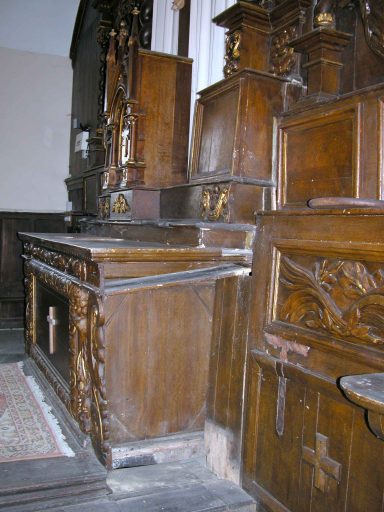 Le tableau d'autel de la travée centrale et le tabernacle à armoire eucharistique trapézoïdale manquent (un tabernacle néogothique a été installé à la place du tabernacle originel). Statue de saint Christophe : pied gauche de l'enfant Jésus et coin inférieur gauche de la terrasse cassé, trous d'envol d'insectes xylophages, il manque un attribut (bâton) dans la main droite de saint Christophe. Ensemble entièrement repeint en faux bois et redoré, ce qui a empaté les reliefs ; statues repeintes au naturel et redorées.