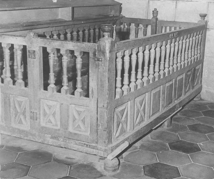 Registre inférieur : panneaux pleins moulurés ; registre supérieur : balustres tournés (dossier et accotoir agenouilloir) ; une porte sur chaque petit côté